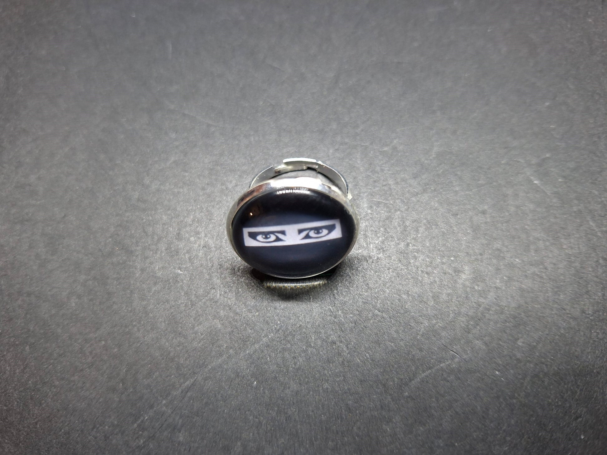 ornate ring 22mm wide and smallest size is apx 6.5 or N , and adjustable to make it a larger size .Black and white Image of your choice of image of eyes , Siouxsie or logo