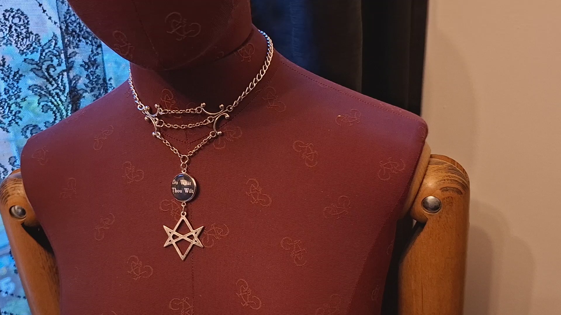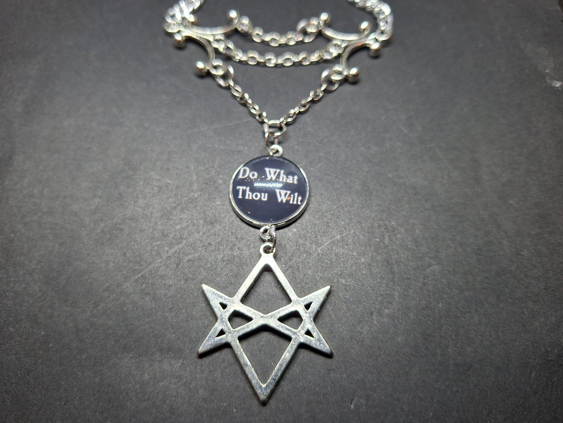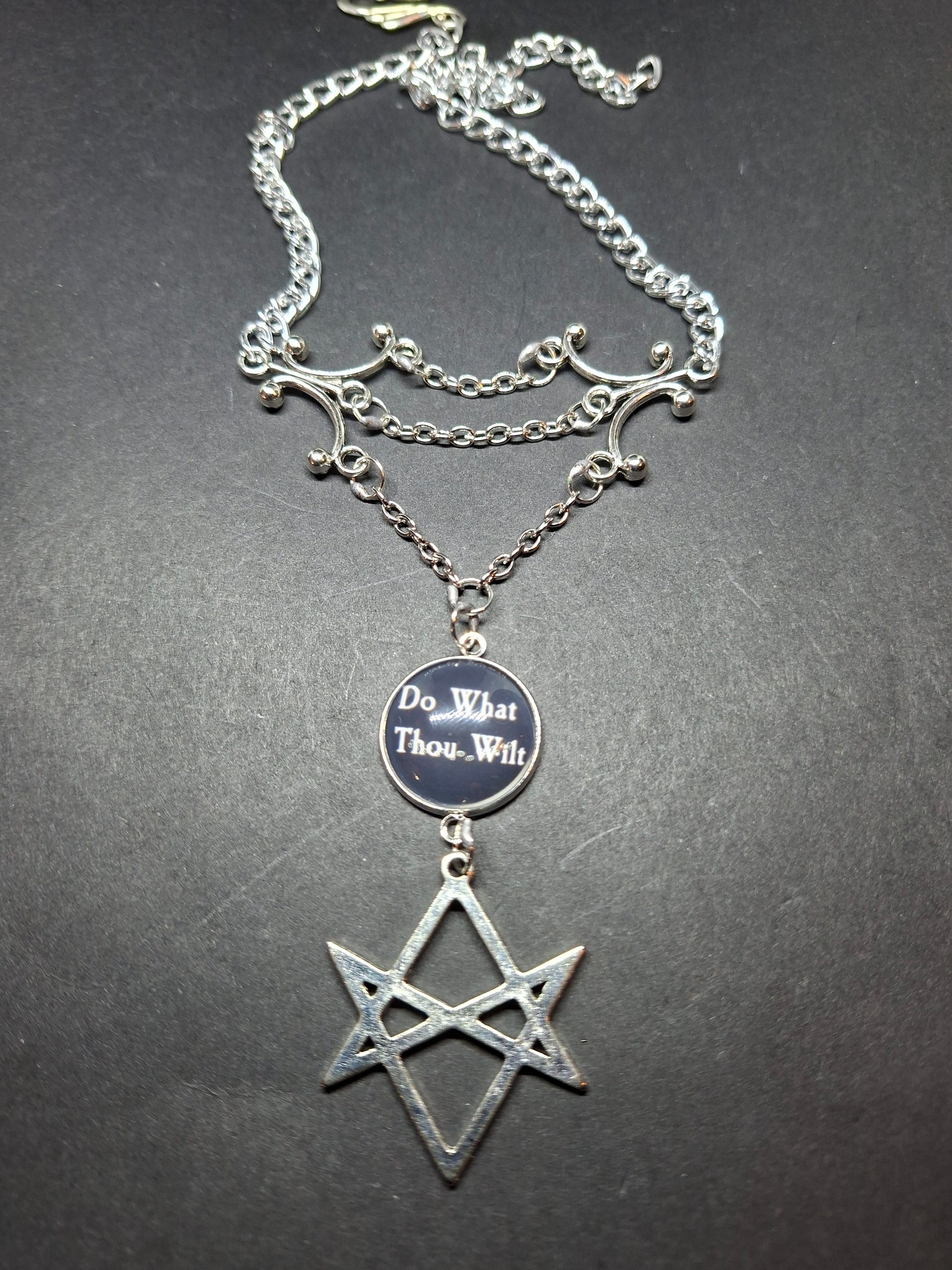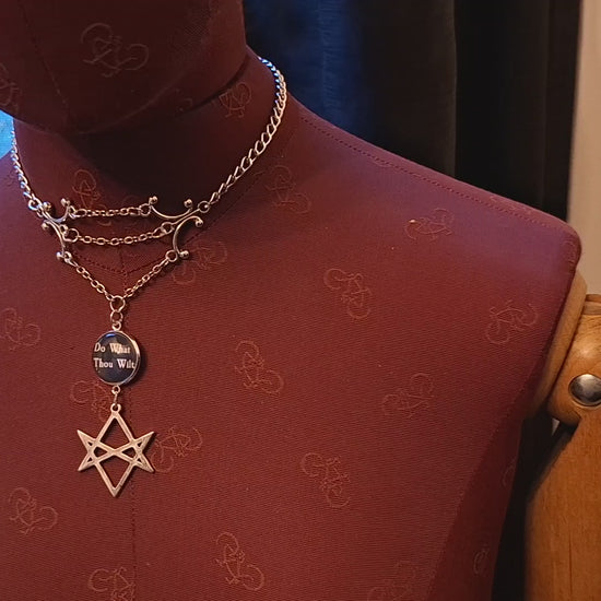 A delicate choker or necklace consisting of two chandelier style findings held apart by three increasing lengths of chain with the longest having a white lettering on black "Do what thou wilt" design with a magnifying effect glass dome glued on top, with a metal unicursal hexagram underneath , there are two lengths of chain at either side to have as tight as you desire ,all jump rings are soldered .Comes at 40 cm , however we can make longer to taste please use personalization option .comes in hessian gift bag