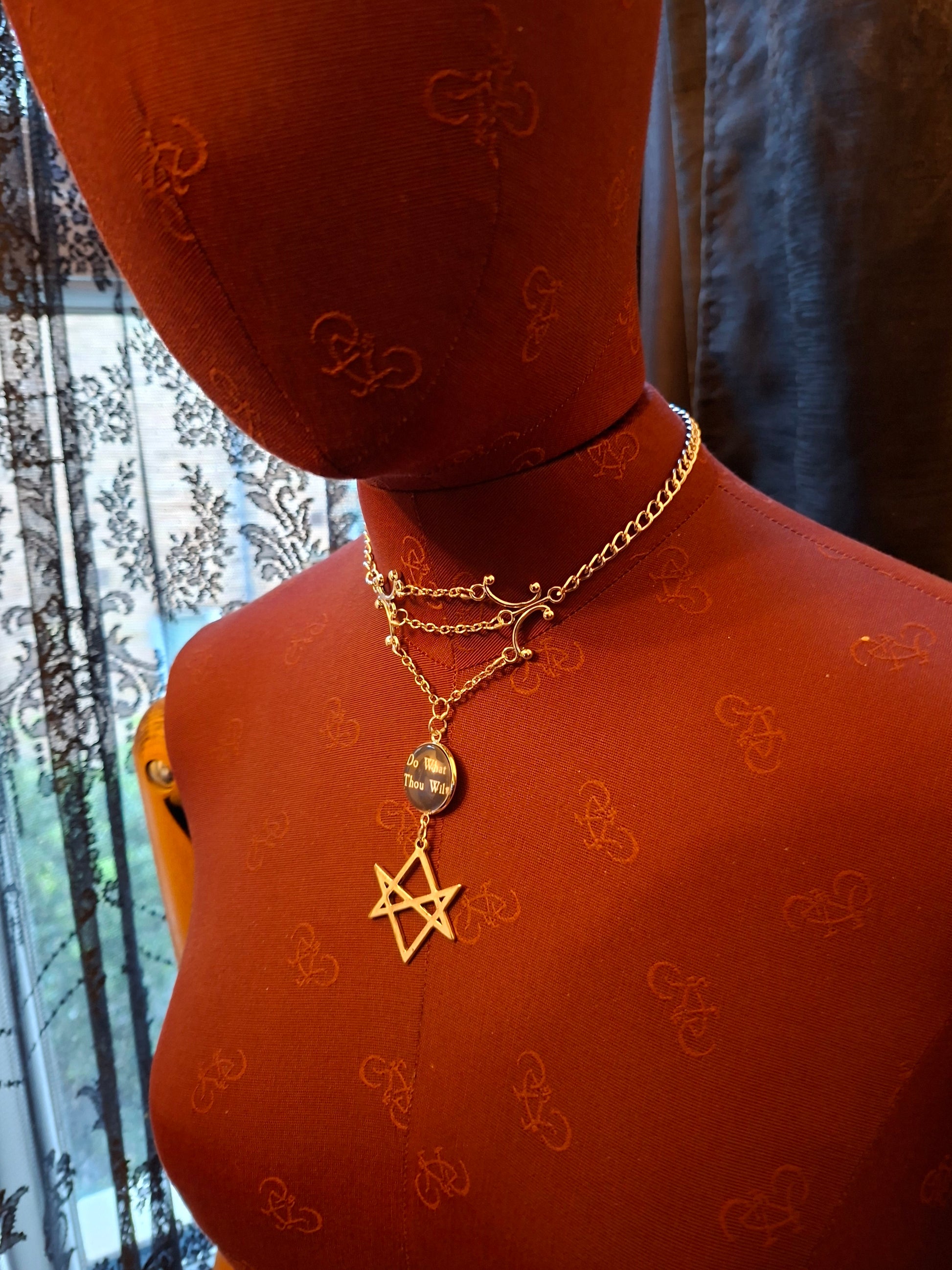 Goth Gothic Witchy Occult Aleister Crowley, unicursal hexagram " Thelema Magick " chandelier choker/necklace