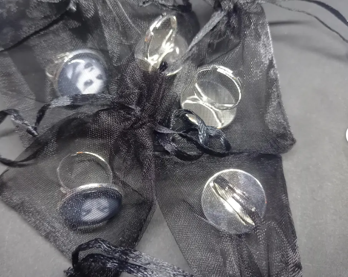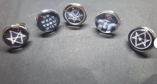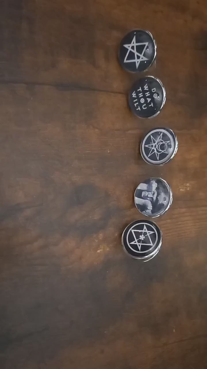 Crowley inspired ornate rings , each 22mm wide and smallest size is apx 6.5 or N , and adjustable to make it a larger size .Black and white Image of your choice of unicursal hexagram V1 , Do What Thou Wilt ,Mark of the Beast , Mr Crowley and unicursal hexagram V2 .Mounted the a magnifying effect glass dome glued on top, with two hanging chains and charm . Perfect for the witch/demon in your life ,will complement any outfit ,a perfect all-round accessory ,comes in a hessian gift bag.