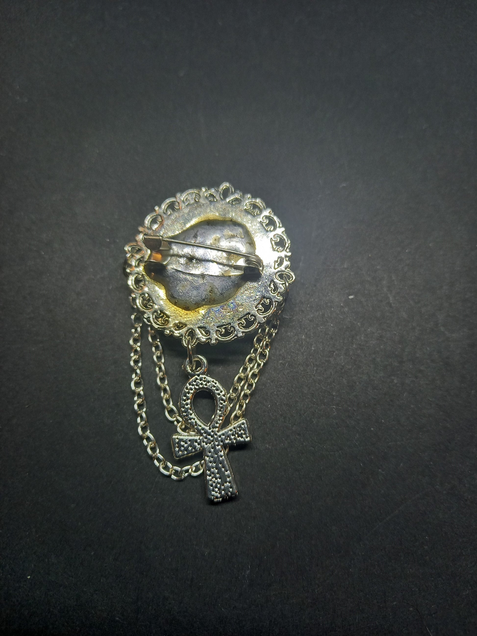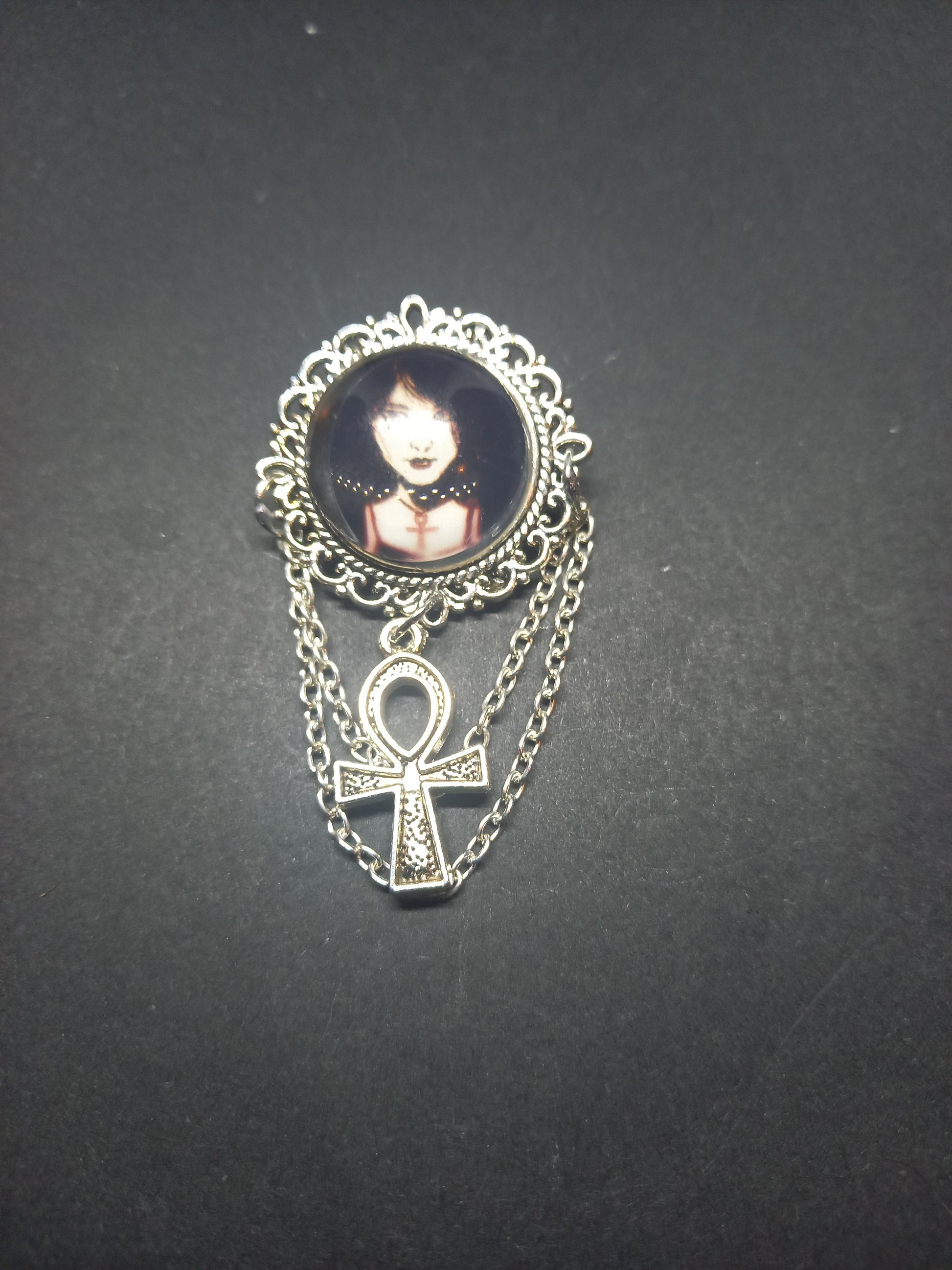 Features a stylised sepia image of Death from the sandman comics set in ornate finding with a magnifying glass dome glued on top with two hanging chains and metal ankh charm .With safety lock pin bar soldered to the back .Perfect for the witch/demon in your life ,will complement any jacket ,bag hat etc etc ,a perfect all-round accessory ,comes in a hessian gift bag. 3.3 by 5.5 cm .We can always customise this as with all our items just send us your ideas.