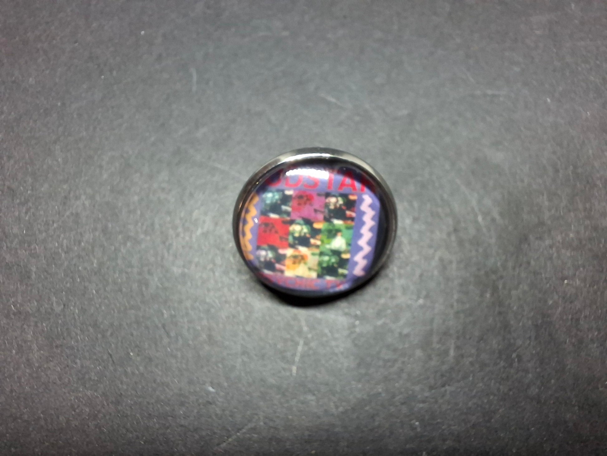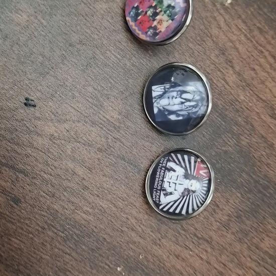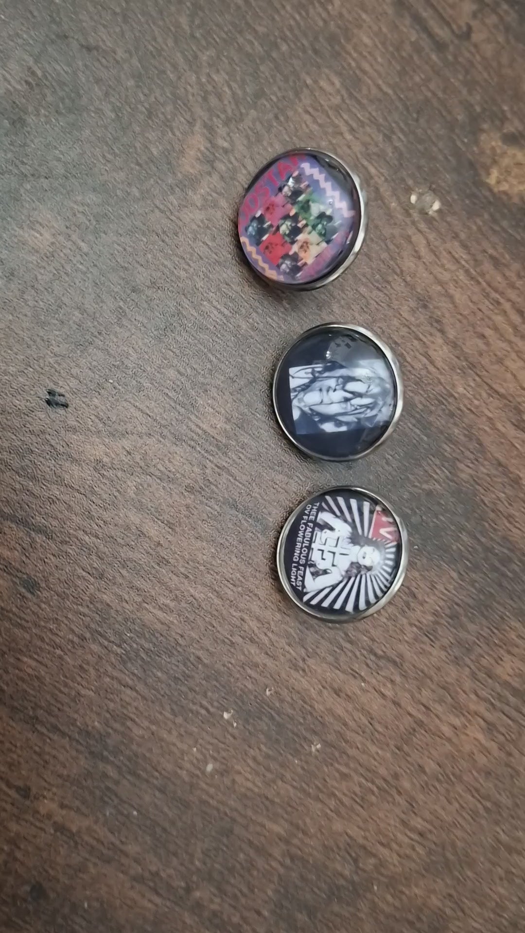 each measures approximately 22 millimeters ,first is the Godstar cover , then an image of young Genesis lastly an early promo image .All have a clasp style back ,Then an image glued to the finding and then a glass dome glued on top of the image. This has a magnifying effect on the image .All come in a gift bag .Perfect for the Count or Countess in your life of just to treat yourself.
