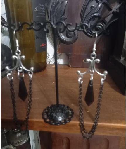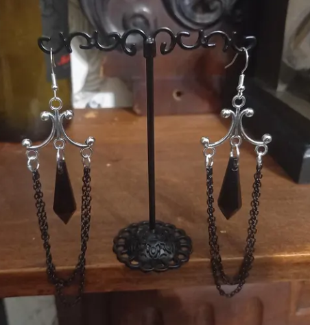 Sold in pairs and have hypoallergenic ear wires ,all jump rings soldered .A metal 2.5 cm by 3. cm chandelier style finding with two lengths of black metal chain with a 3 cm long black acrylic teardrop crystal , 10 cm long in total .A great lightweight item that goes with so many looks , makes an ideal gift of just to treat yourself .Comes in hessian gift bag