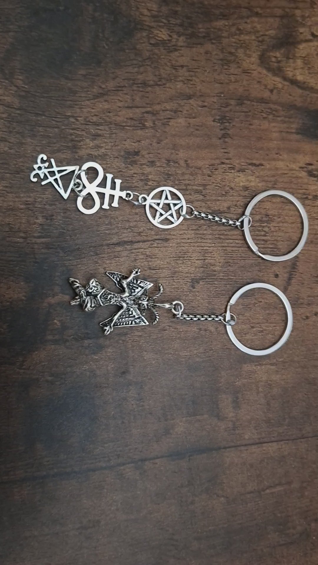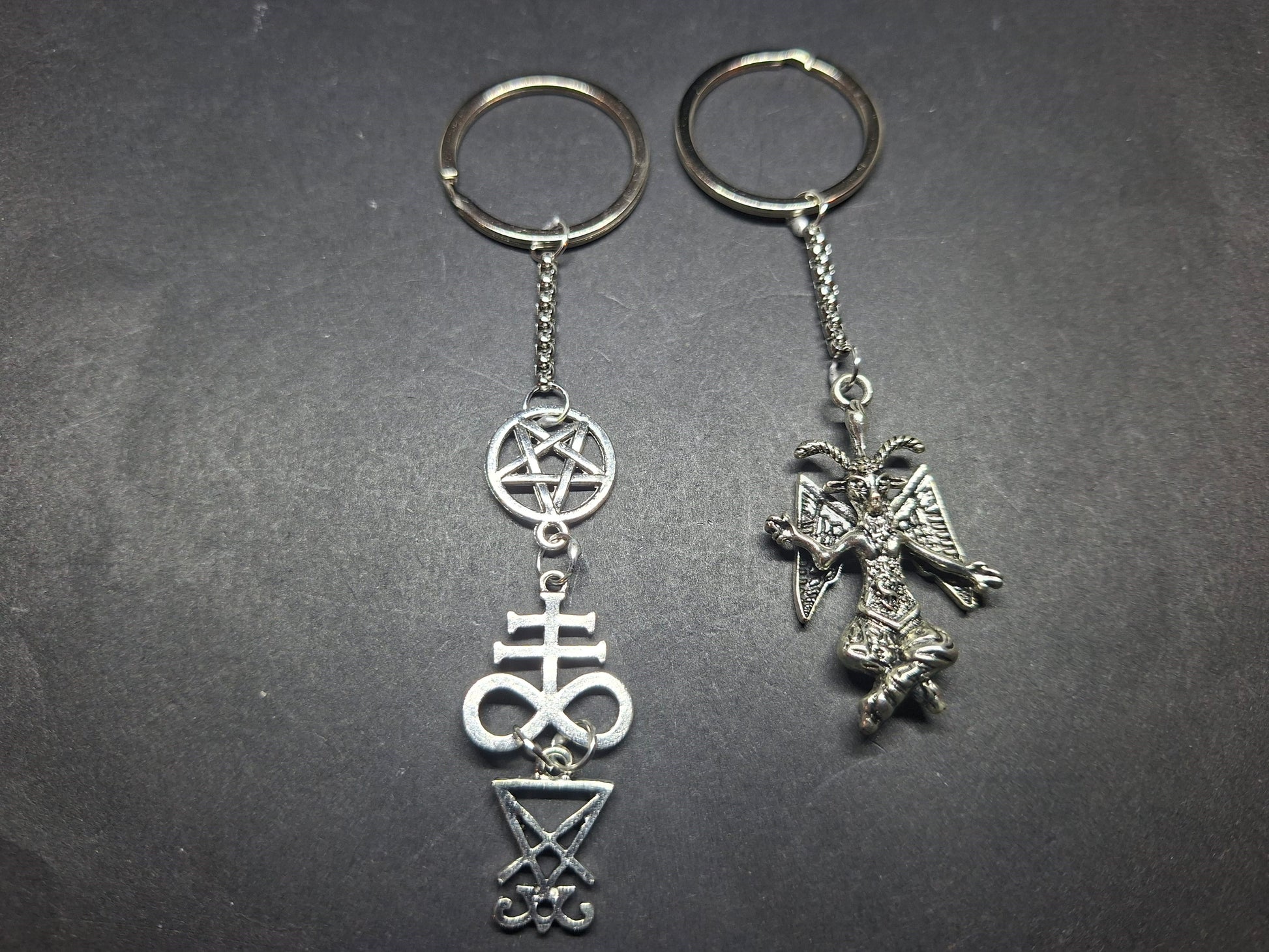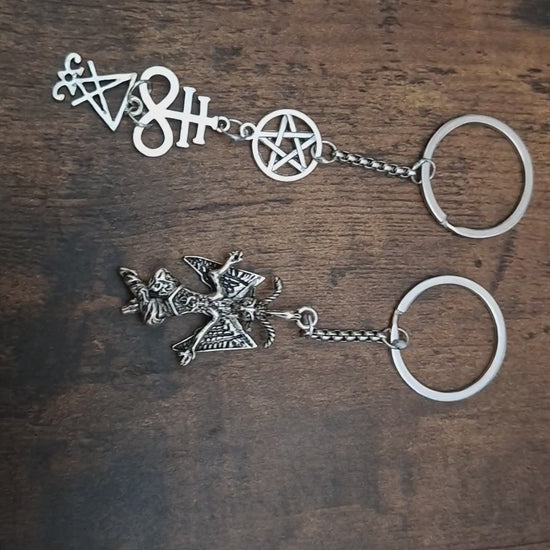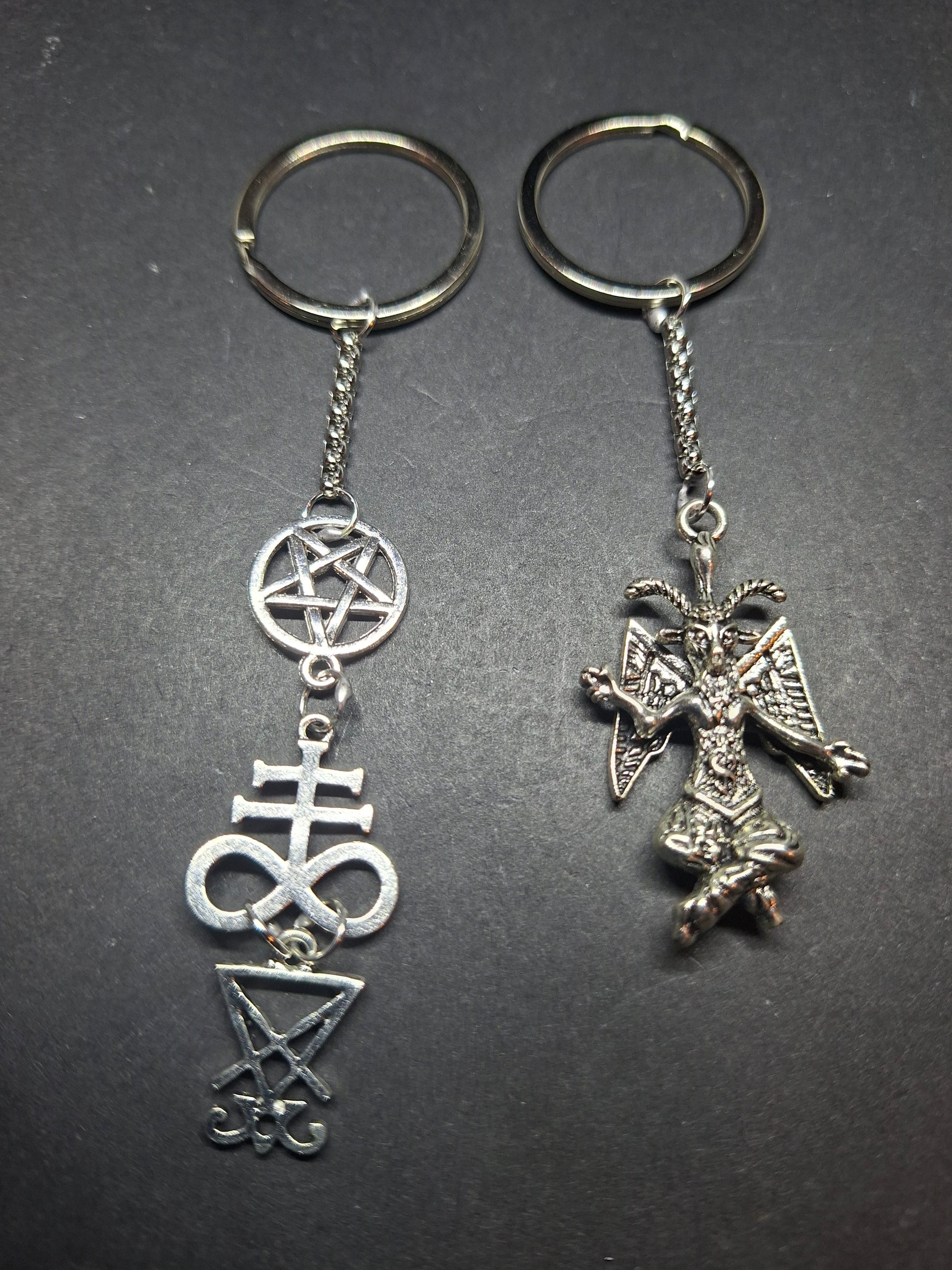 Either a metal baphomet (8 CM LONG ) or satanic trinity (10.5 CM LONG)made up of inverted pentagram , cross of satan and sigil of satan charms then a length of chain that is attached by soldered jump rings at each end and to a 30 MM wide split ring ,comes in a organza gift bag .an ideal small gift for the Goth /Witch in your life or just to treat yourself .We can always customise this as with all our items just send us your ideas .